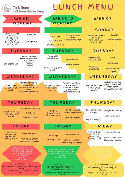 Our Kitchen is run by the school with the help of catering consultants Watson, Lennard and Payne, please see below for our current menu. We also hold allergen information for this menu in the kitchen, if you have any concerns please telephone the school and talk to Cathy our cook.